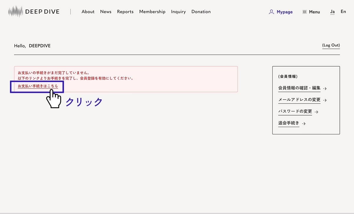 万が一お支払いに失敗している場合は、マイページにログインしても会員限定コンテンツが表示されず、「お支払いが完了していません」旨のメッセージが表示されます。その場合は画面の案内に沿って、Stripeの決済ページから再度お支払い手続きを行ってください。