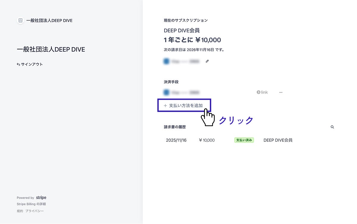 ②「領収書発行」ボタンをクリックすると、Stripeのページが開きます。