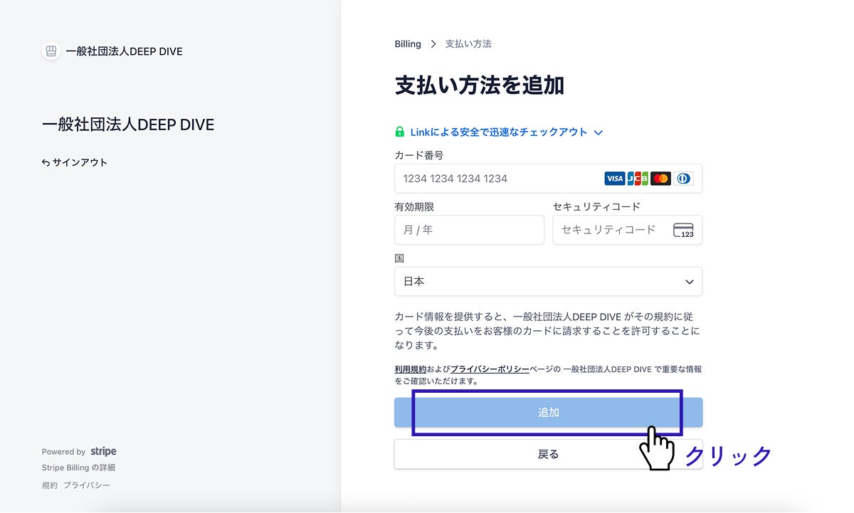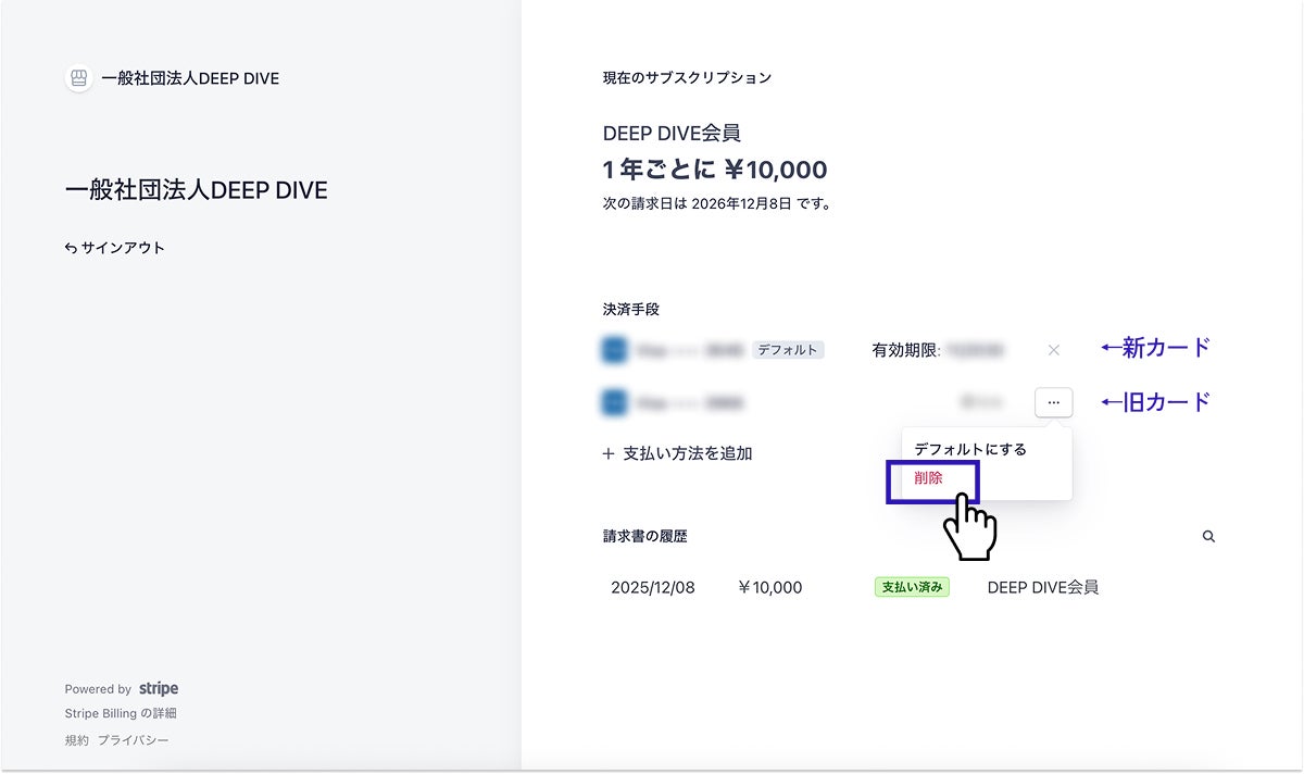 DEEP DIVE会員の初年度会費は、新規アカウント登録フローの途中でオンライン決済によりお支払いいただきます。お支払いにはStripeを使用しており、クレジットカードまたはデビットカードがご利用いただけます。